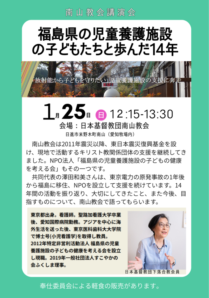 1月25日(日)12:15~13:30 AHI近くの日本キリスト教団南山教会にて「福島の児童擁護施設の子どもたちと歩んだ14年」と題した講演会が行われます。話し手は、NPO法人「福島県の児童養護施設の子どもの健康を考える会」代表の澤田和美さん。小児看護学を専門として、大学で教鞭をとっていた澤田さんは、2011年3月11日の出来事に突き動かれ、福島へ。その活動は、2021年度「新しい東北」復興創生の星顕彰を受けました。
