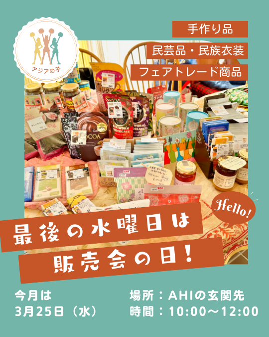 来週の水曜日は、当団体の玄関先で、AHIのサポートグループ「アジアの子」のみなさんが民芸品、手作り品、フェアトレード商品を販売されます。